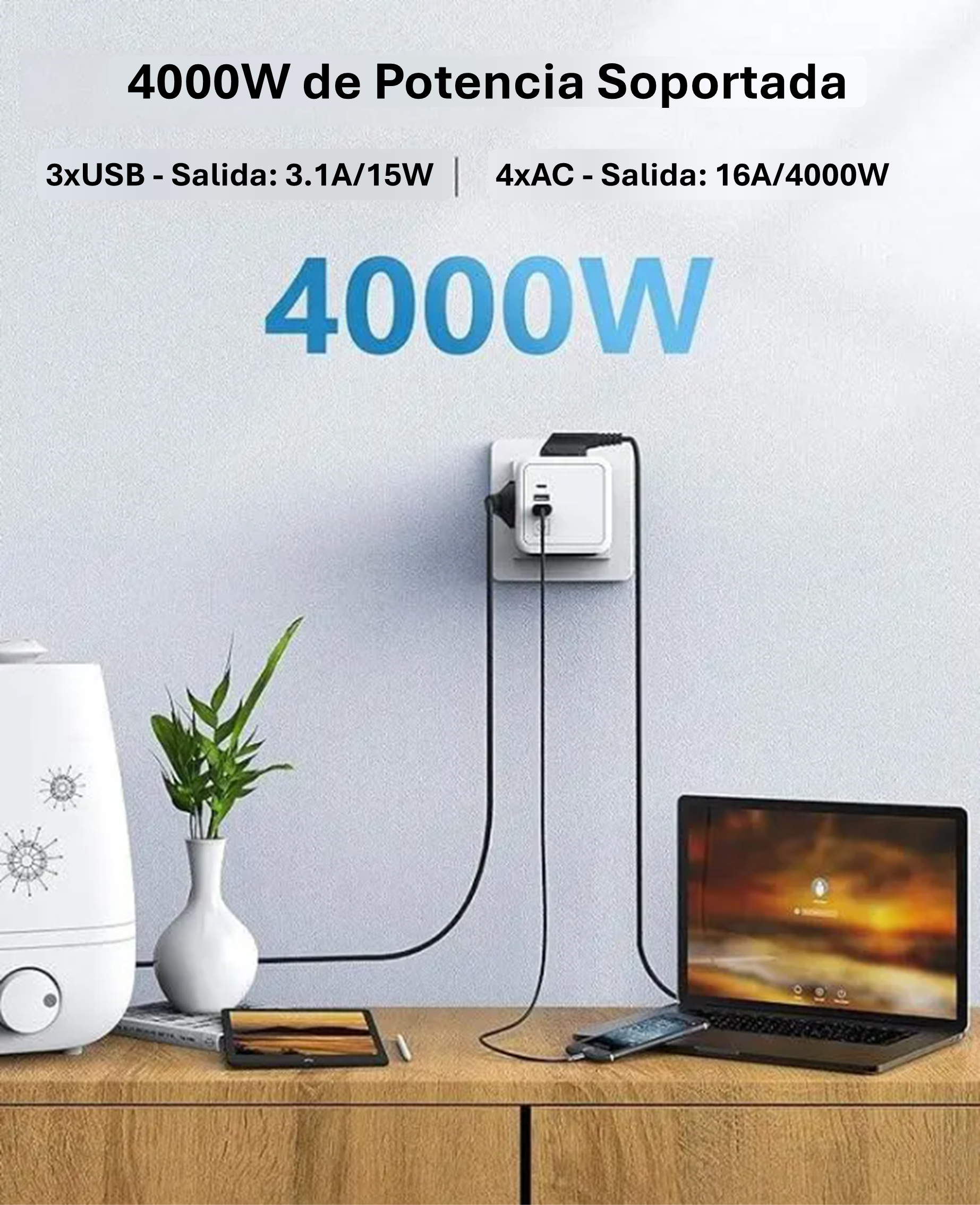 Su capacidad de 16A/3680W permite conectar equipos de mayor demanda con seguridad y estabilidad. Ideal para calefactores, termos, aires acondicionados portátiles, lavadoras o cafeteras.