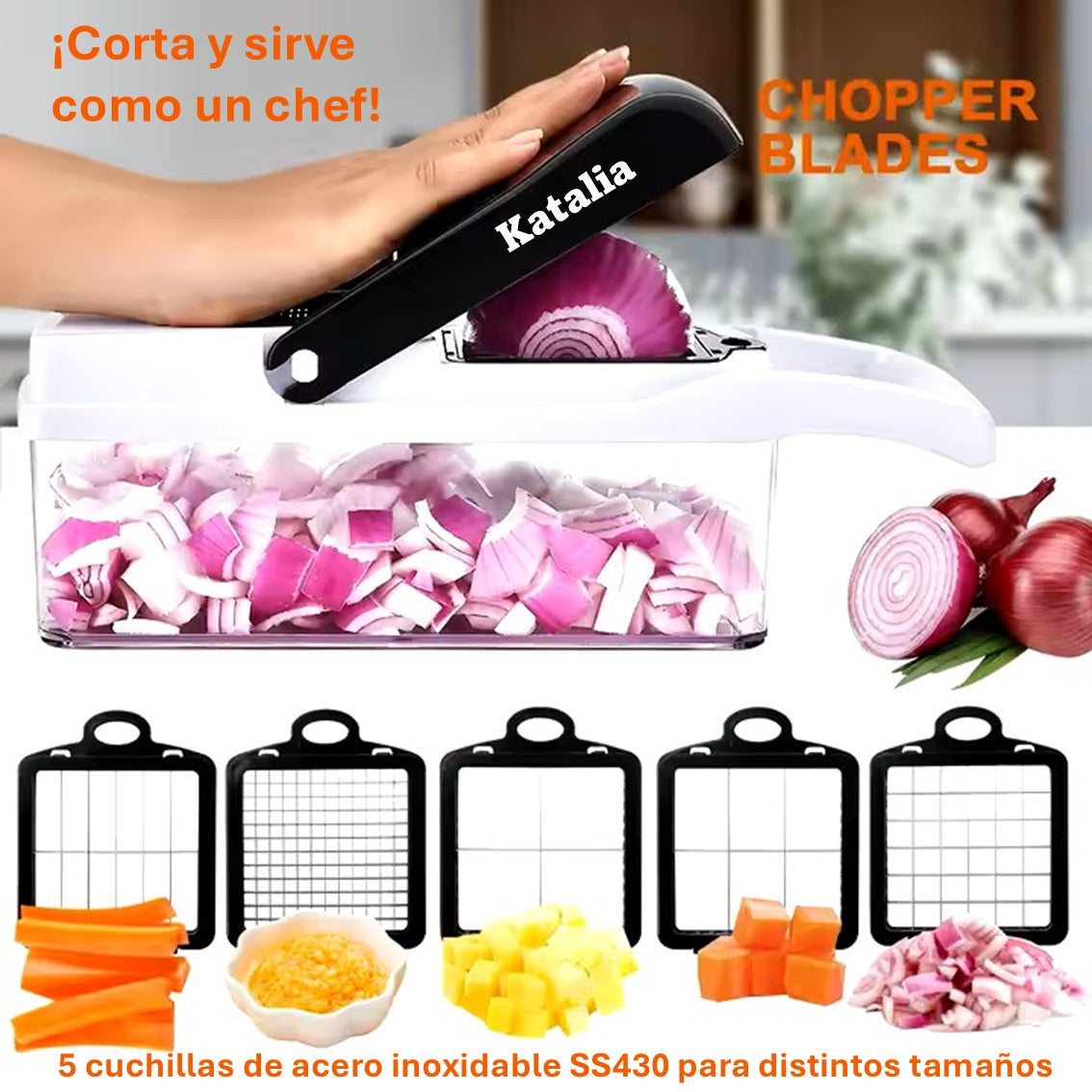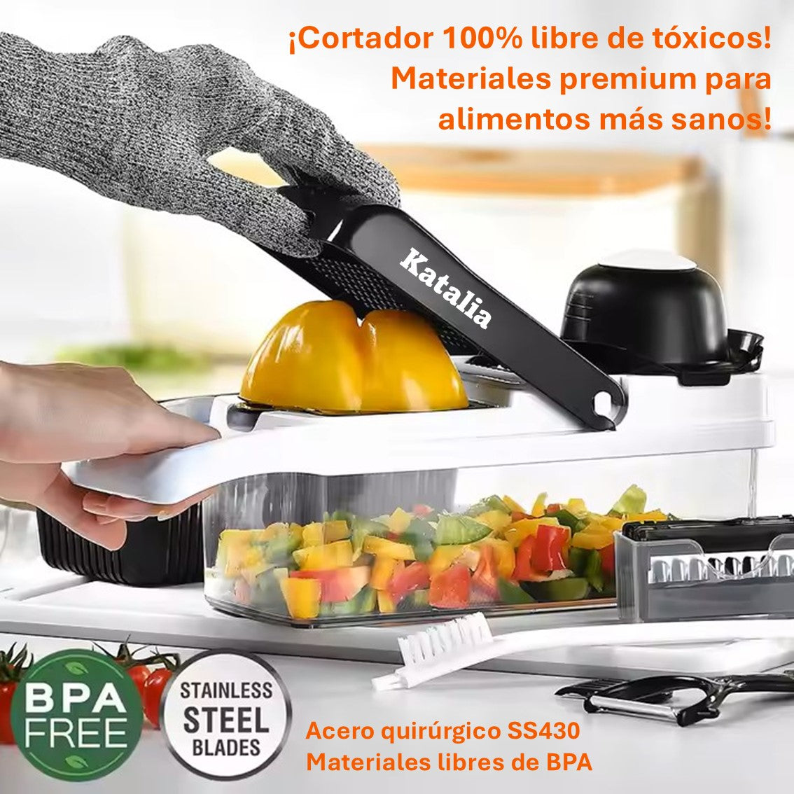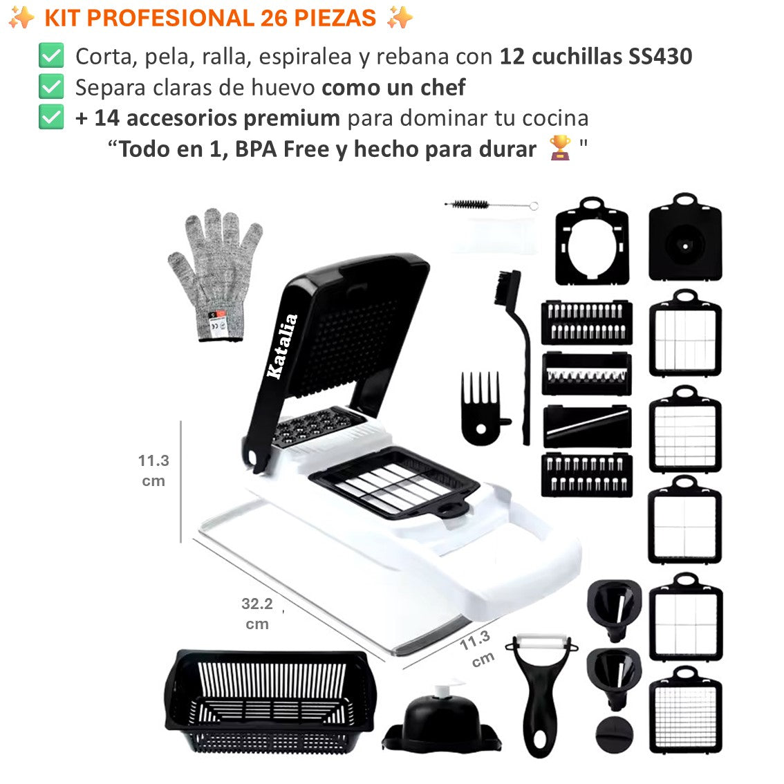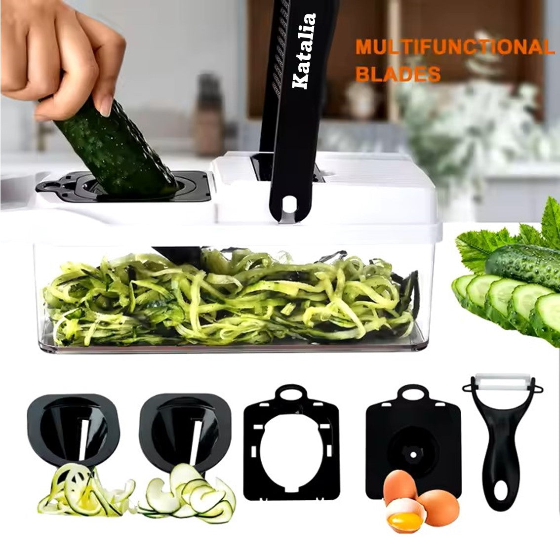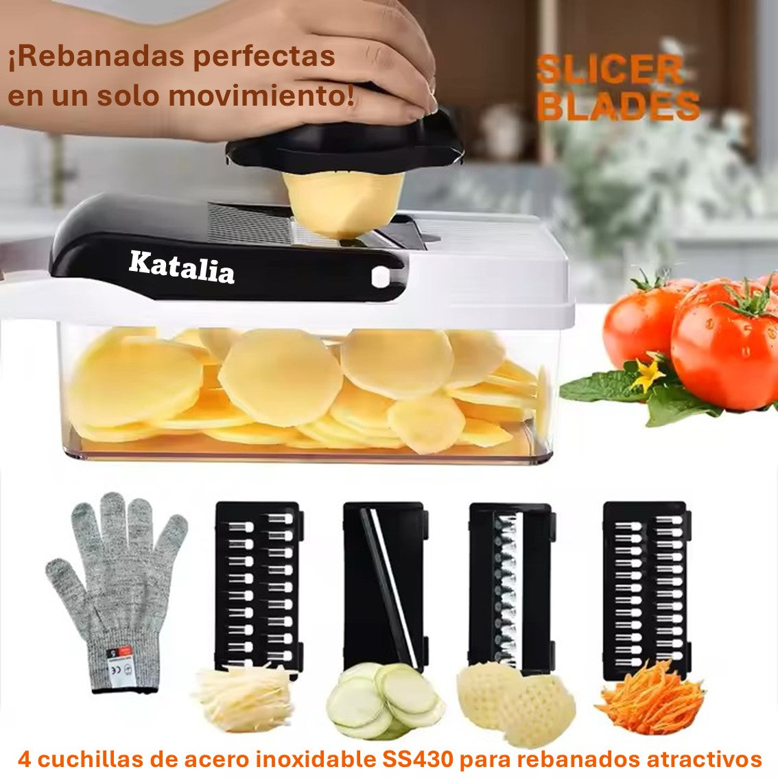 Transforma tu experiencia en la cocina con la mandolina multifuncional Katalia, un set completo de 26 piezas diseñado para facilitar la preparación de verduras y frutas con precisión y rapidez. Ideal para cocineros, vegetarianos y amantes de la cocina saludable, este cortador manual es el aliado perfecto para crear platos deliciosos y nutritivos.