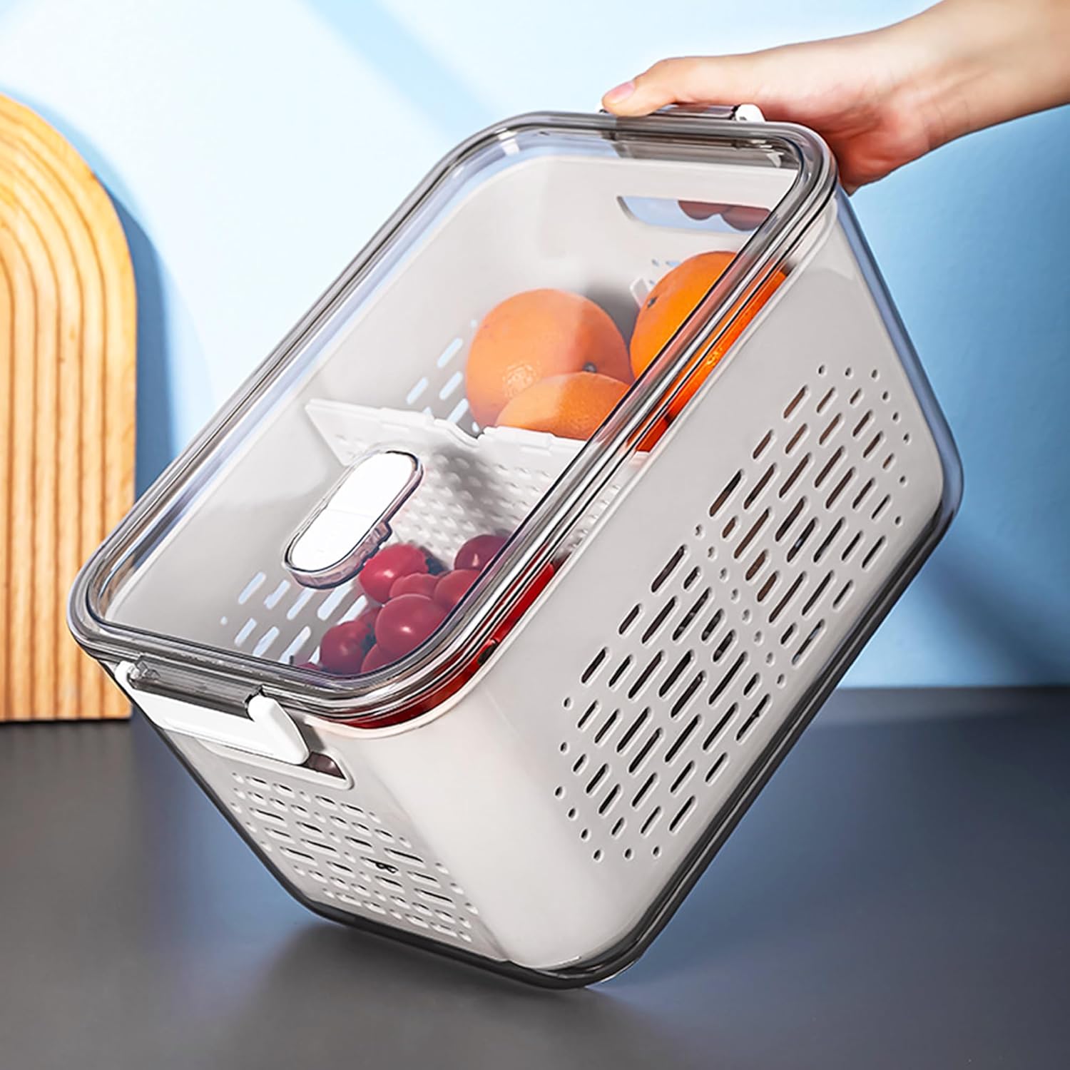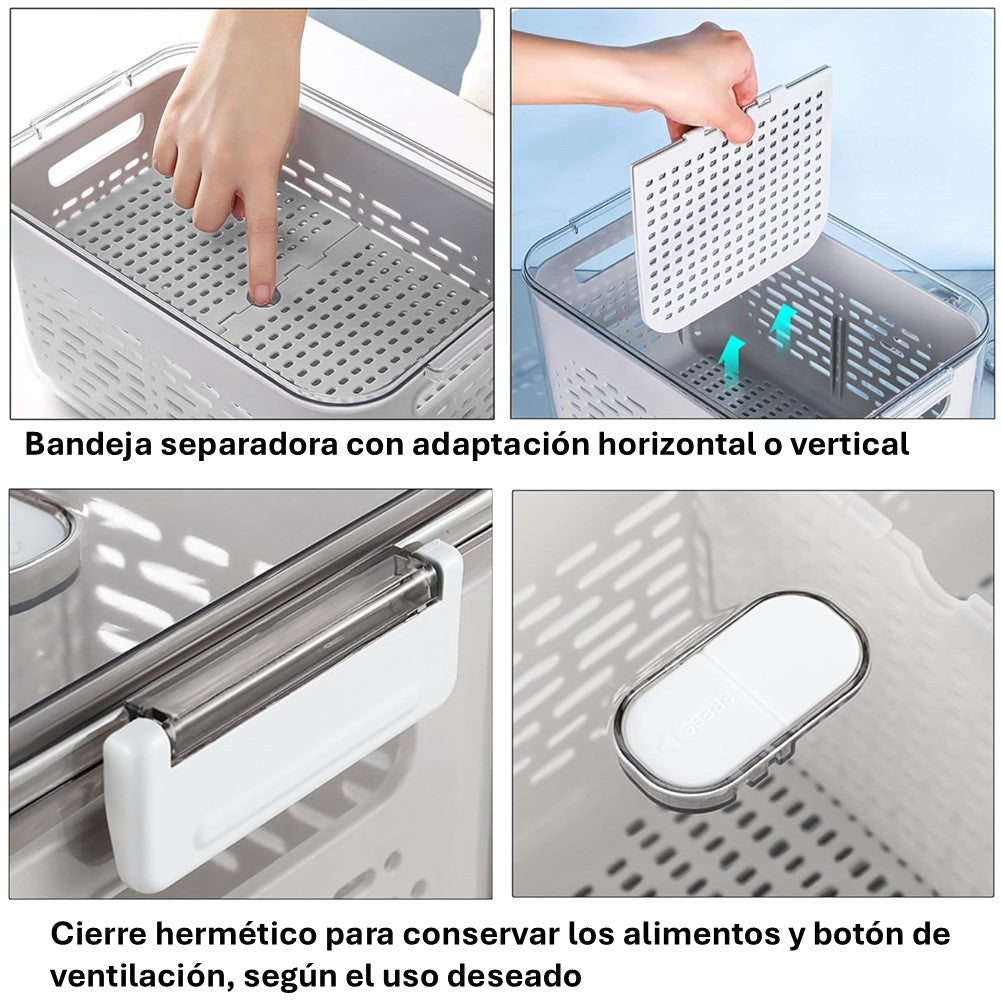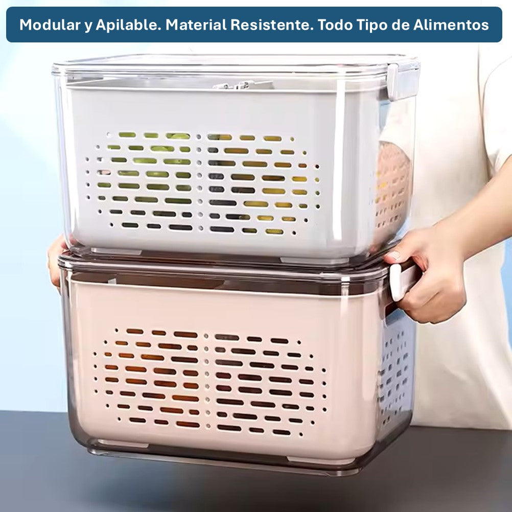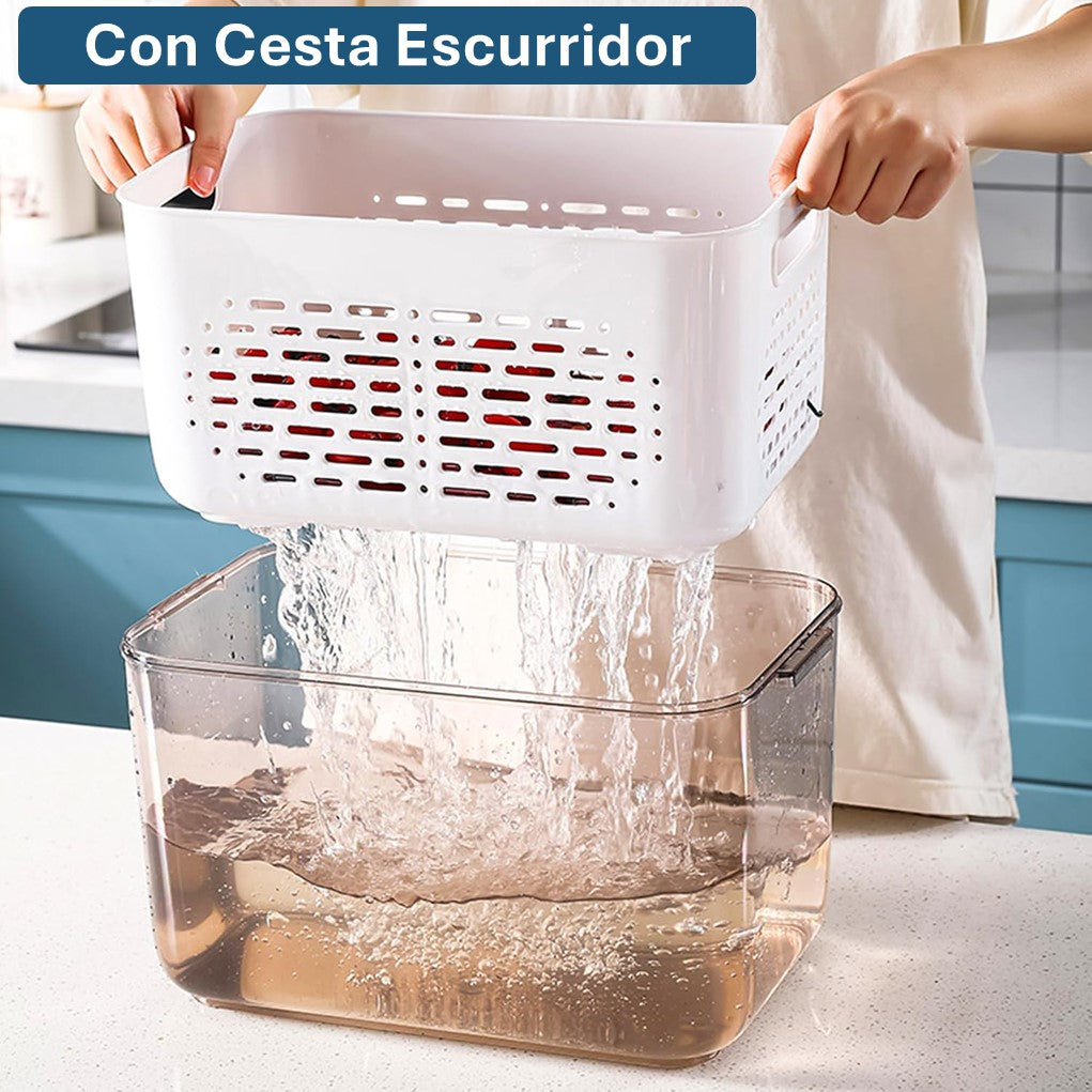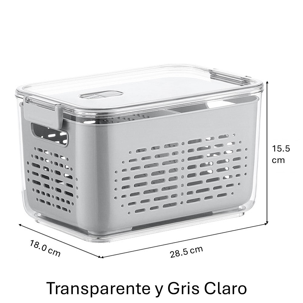 Fabricado con materiales resistentes y libres de BPA, garantiza durabilidad y seguridad para tus alimentos. Su diseño transparente facilita la visibilidad del contenido, mientras que la tapa incluida protege los alimentos y mantiene la frescura. Además, cuenta con un escurridor integrado que permite almacenar alimentos frescos y escurrirlos cómodamente.
